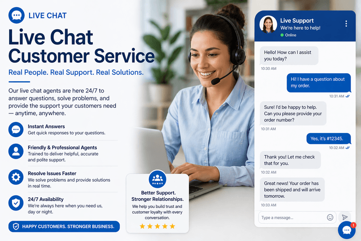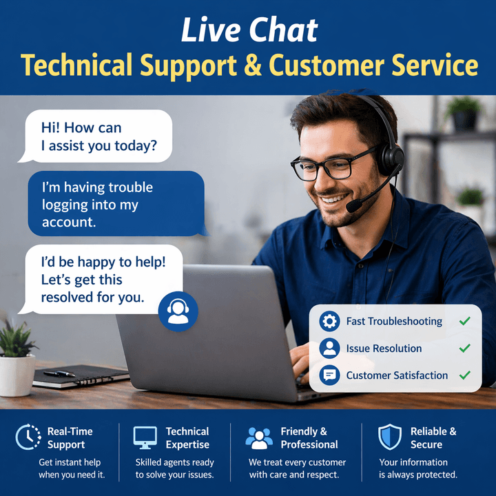 Our trained live chat agents provide fast and professional technical support and customer service directly through your website. We assist customers in real time with login issues, account access, password resets, website navigation problems, order processing concerns, billing questions, and general product or service inquiries.