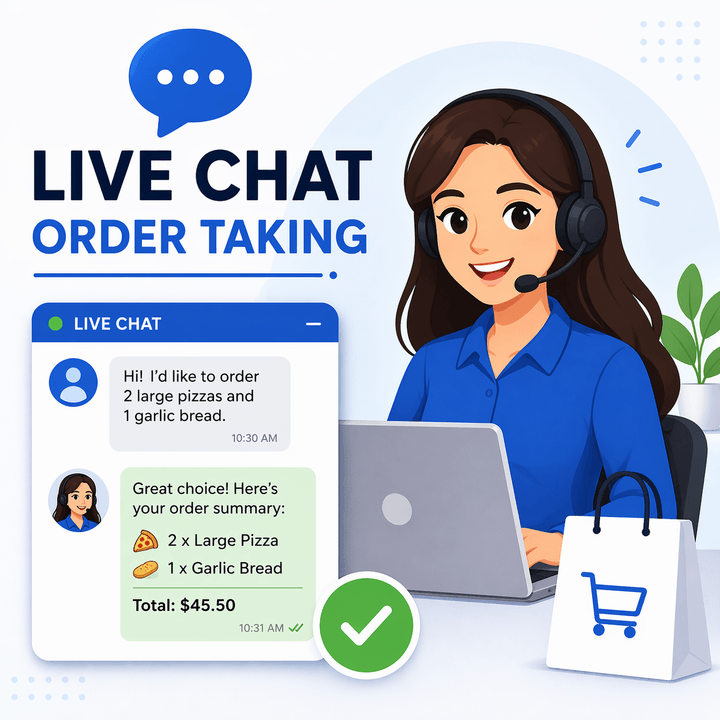 Our live chat order taking service allows your business to capture and process customer orders directly through your website in real time. When visitors are ready to buy, our trained agents step in to assist them with placing their order quickly, accurately, and without friction.
